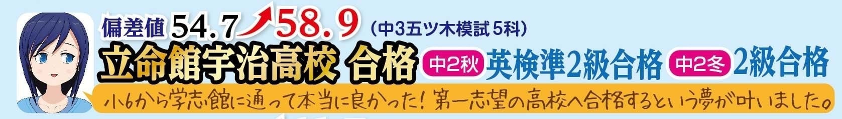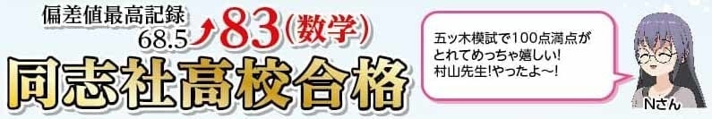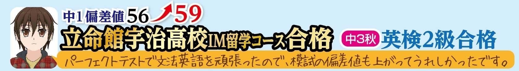 府県No.1、No.2の私立合格を希望するのであれば、公立入試組と同様の予定では間に合いません。遅くとも3年生の始めにはご相談ください。また、高校からの関関同立合格は狭き門です。偏差値55程度からの逆転合格を成し遂げた生徒さんのように、実力での勝負!或いは英検や漢字検定などをからめた推薦での勝負!など、お子様一人一人に合わせた進路指導を得意としております。是非、ご相談ください。「え?そんな方法があるんですか?」というお話ができるかと思います(塾長:村山が面談を行います)