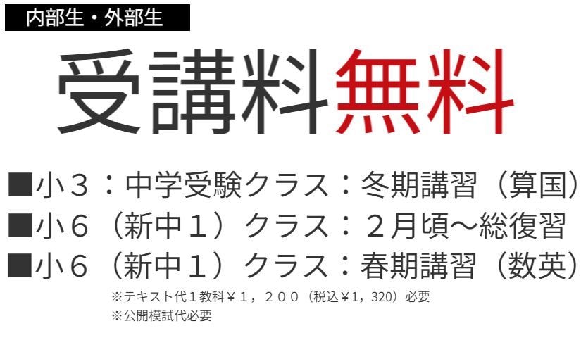 冬期講習会のご案内2025.11.13 ■小3冬期講習無料(中学受験クラス)!! 冬期講習のチラシ案内、特徴、イベントの告知が完成いたしました。 料金表、時間割の閲覧が可能となりました。 詳細は、「内部生のページのデジタルパンフレット」「外部の方が、資料請求のページのデジタルパンフレット」の欄をご確認下さい。 |