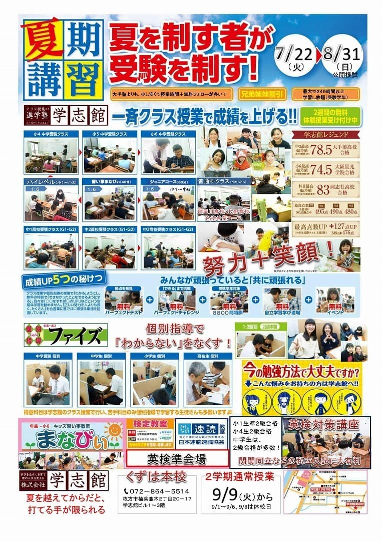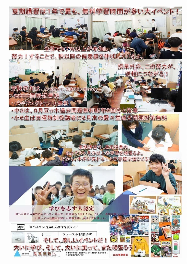 そのため、学志館では、講習期間中、朝の10時~夜の10時まで塾を開け、授業+無料特訓に励む生徒さんを応援しております。