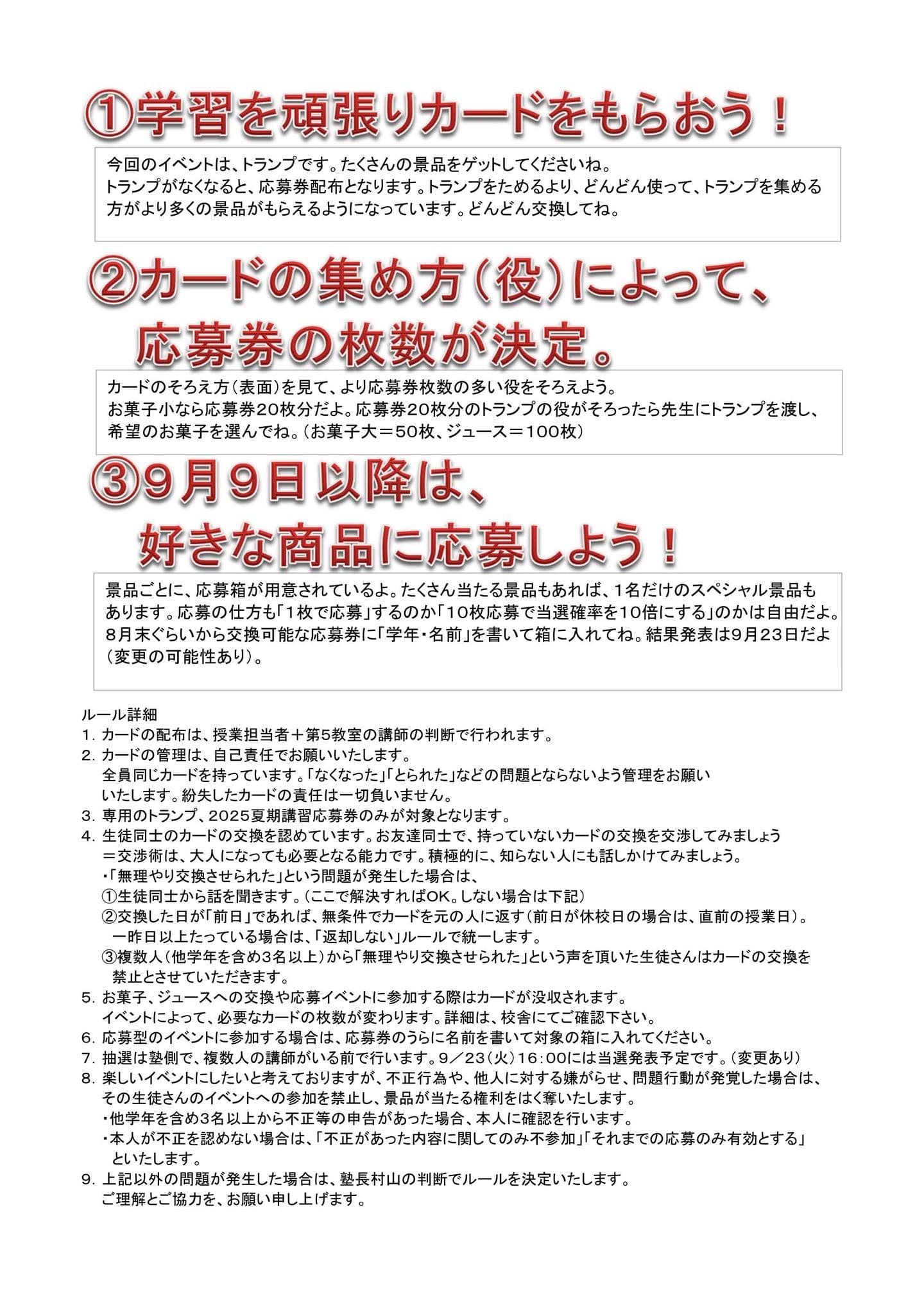 夏期講習のテキストうめ、1学期範囲のテキストのやり残しと○付け、やり直しまで:質問対応等は9/9以降の通常授業にて対応いたします。受験学年は、最優先が8800問暗記となります。