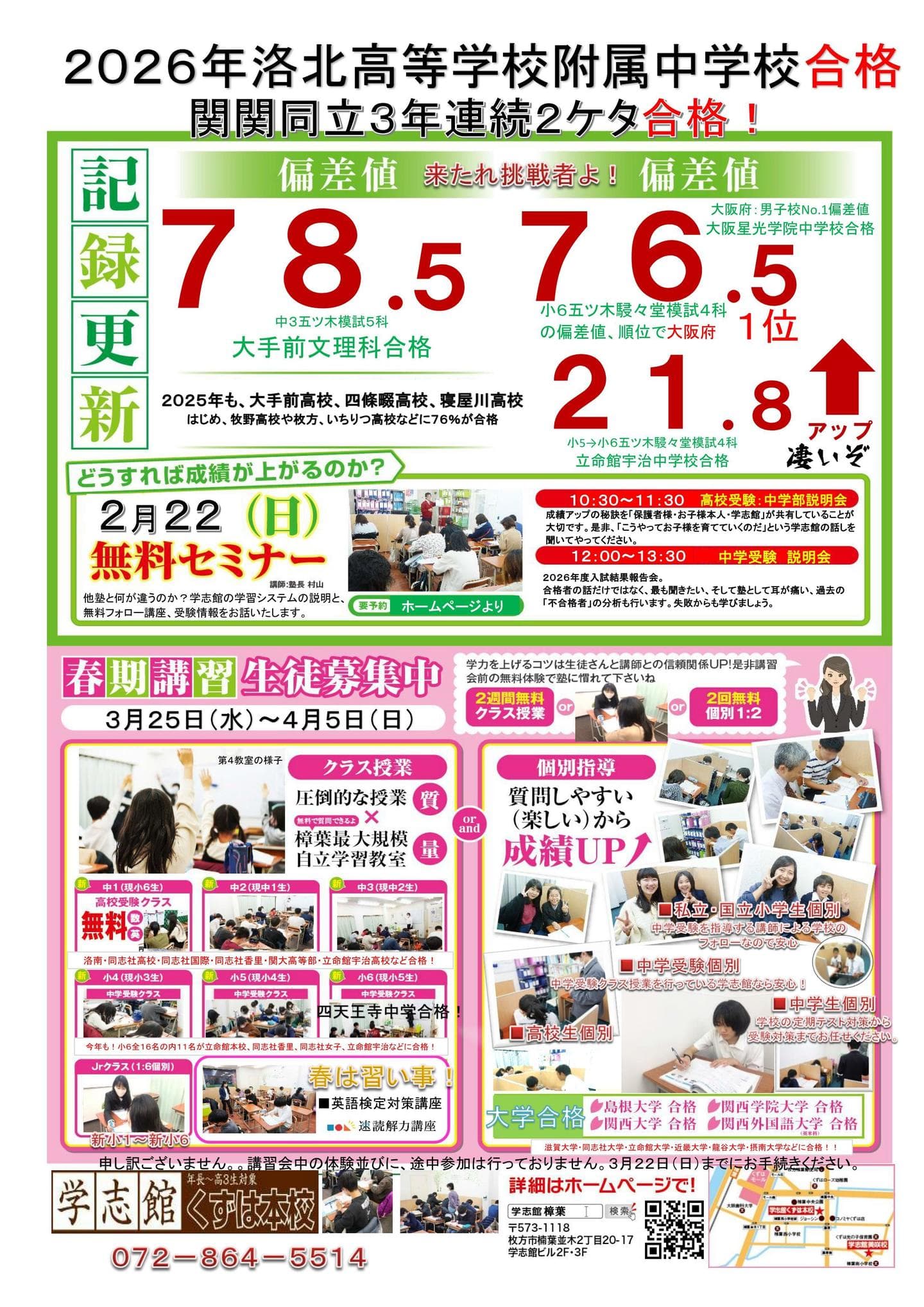 説明会2月22日(日)開催!2026.01.30 ■10:30~11:30 高校受験説明会 ■12:00~13:30 中学受験説明会 内部生はもちろん、外部の方の参加も受け付けております。 是非、この機会に、学志館の学習システムや受験結果分析会にご参加ください。