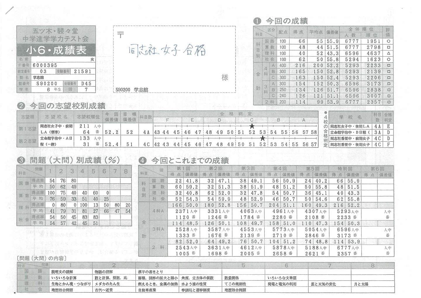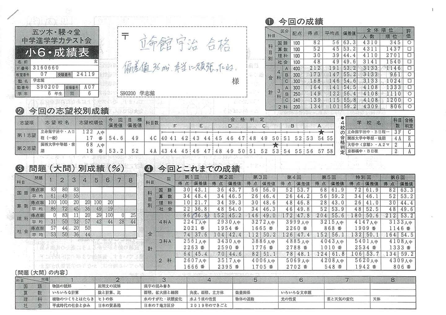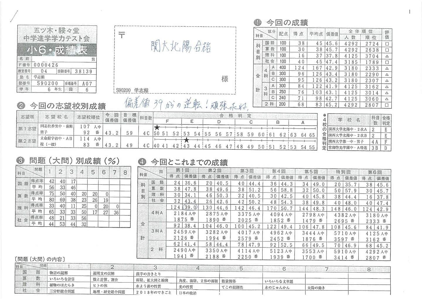 公開模試(小2~小6):有料 年3回(春期・夏期・冬期)の公開模試は有料です。全国のライバルと競い合い、偏差値が出ます。学志館で行っている公開模試は関東の中学受験生もかなりの人数で参加しているためレベルが高いです。厳しい結果が出ますが、小5の時に受験する大阪府で中学受験最大人数を誇る”五ツ木・駸々堂模試”を受験しに行くと、学志館の公開模試の偏差値+5~+8程度以上上の偏差値がとれるため、皆、頑張っています。 |