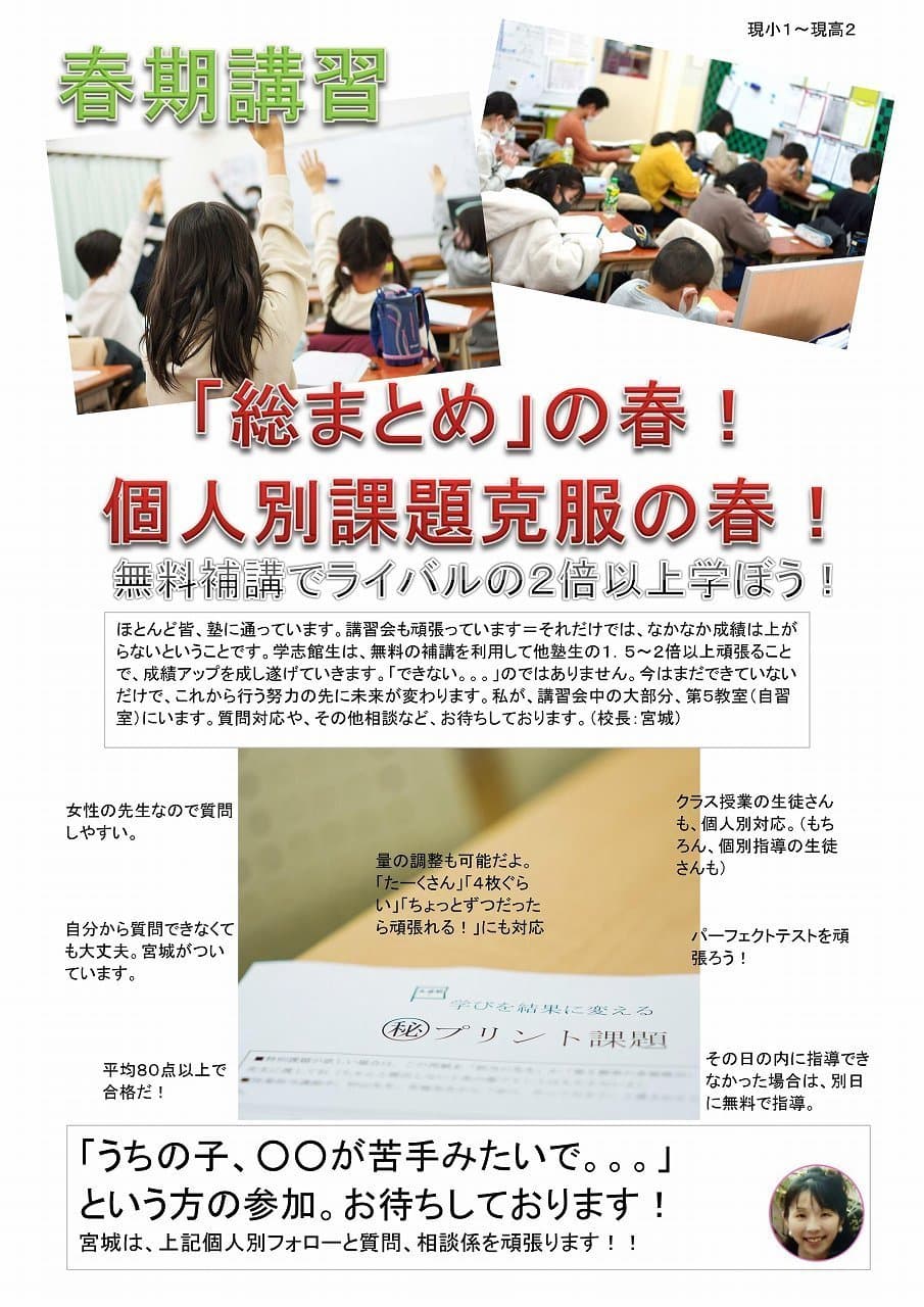 受験学年以外は、「授業テキスト」「授業内で配布のプリント」「パーフェクトテスト(小2~中3。高校生は別プリント)」が基本となりますが、際限なく無料で追加のプリントをお渡しするものではございません。各講習会ごとに、若干の違いはございますが、上記課題が終了いたしましたら通常授業テキストのやり残しを先に仕上げに来るなど最後のフォローをさせていただき、無料の質問できる自習室の使用は終了となります。(その場合、追加プリントはご用意できませんが、完全な自習室の解放は行っております。ご相談ください)