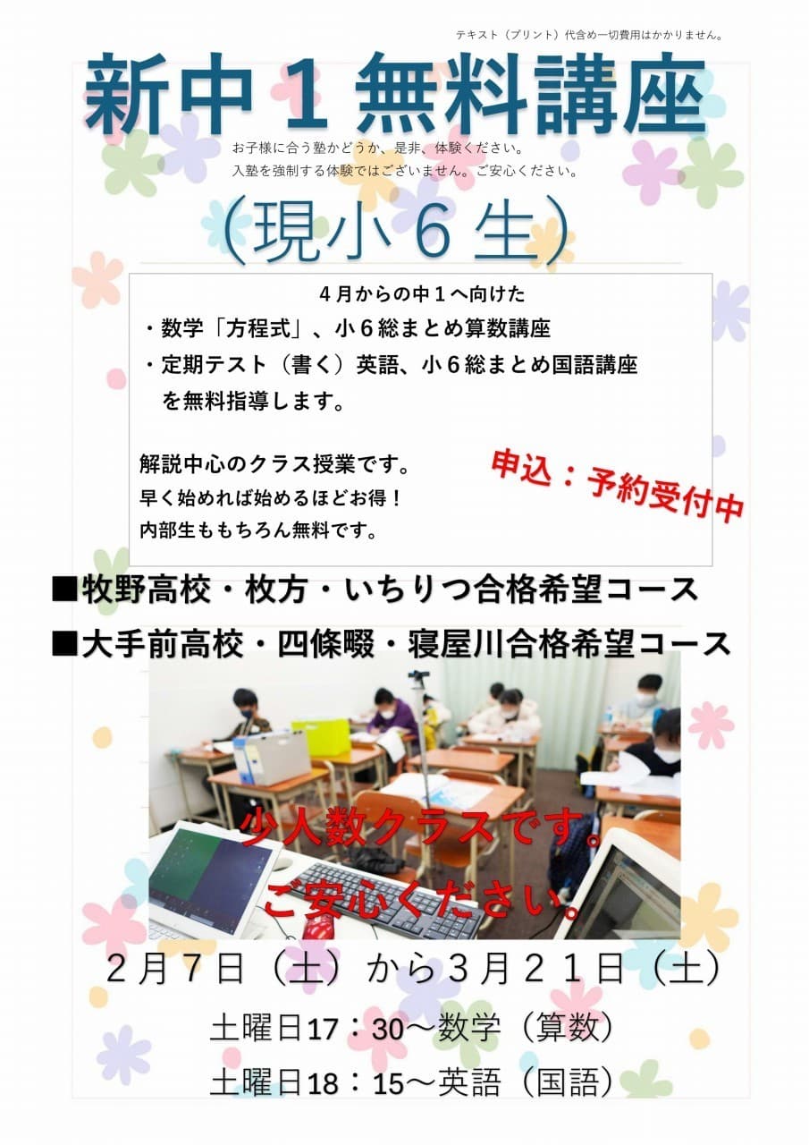講習会中は学習時間が集中して長いことや、たくさんの内部生が参加、無料の補講、イベント等が行われる期間であるため、無料学年以外の体験生の受付を行っておりません。講習会前の体験もしくは、講習会後の通常授業期間での体験をお願い申し上げます。