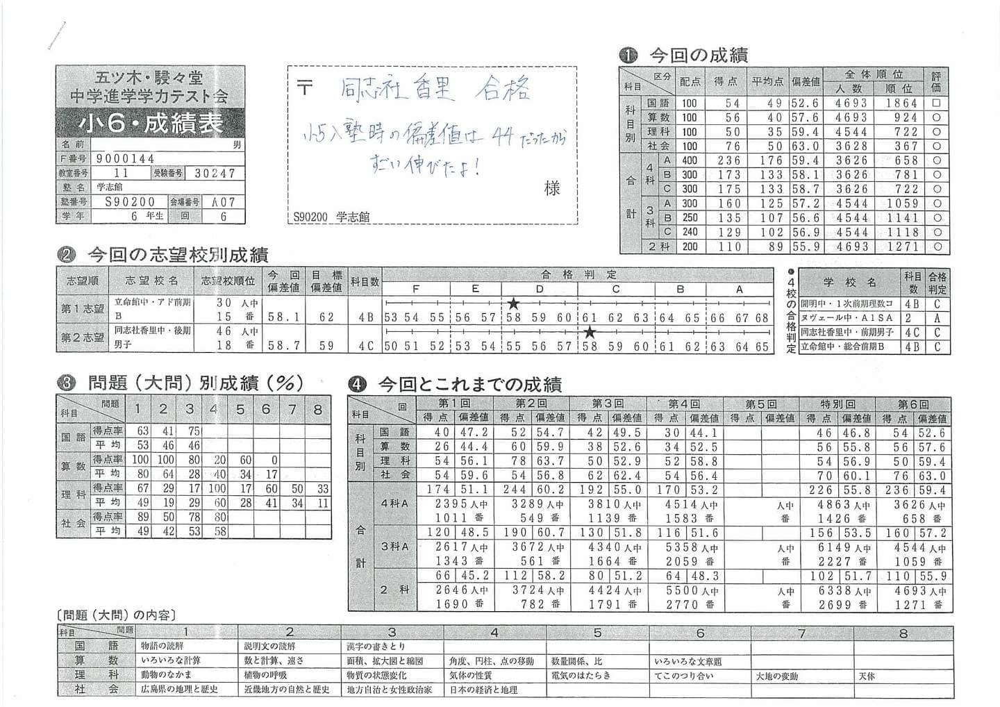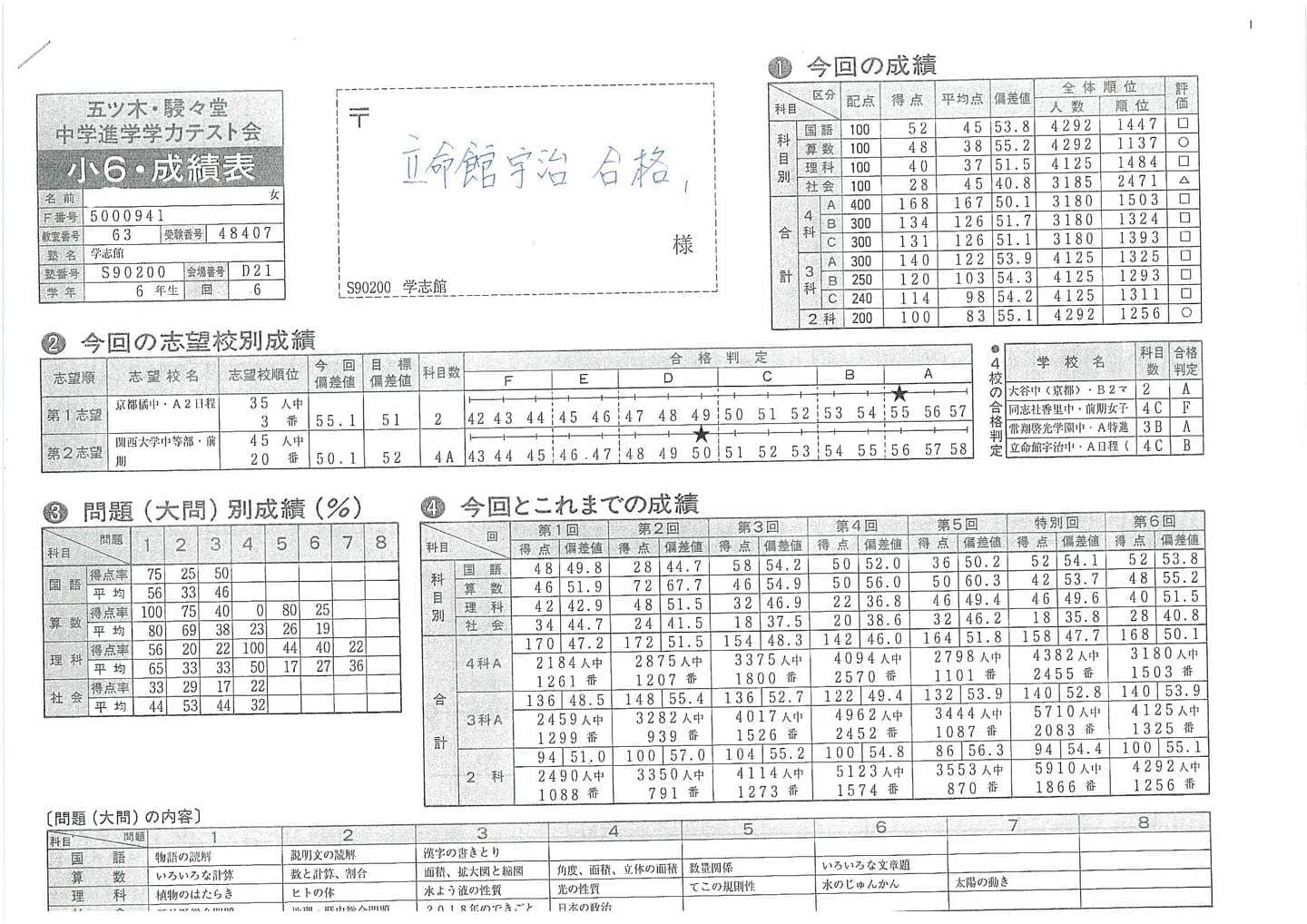 公開模試(小2~小6):有料 年3回(春期・夏期・冬期)の公開模試は有料です。全国のライバルと競い合い、偏差値が出ます。学志館で行っている公開模試は関東の中学受験生もかなりの人数で参加しているためレベルが高いです。厳しい結果が出ますが、小5の時に受験する大阪府で中学受験最大人数を誇る”五ツ木・駸々堂模試”を受験しに行くと、学志館の公開模試の偏差値+5~+8程度以上上の偏差値がとれるため、皆、頑張っています。 |