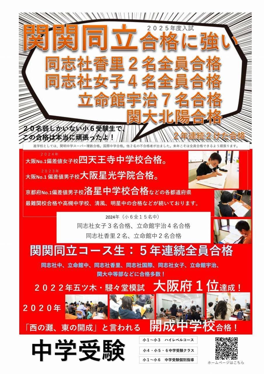 「小6洛星コースは●●教室で開講されます」というようなことはありません。中学受験の全ての授業、特訓がくずは本校(個別指導は美咲校)で受講できます。そして洛星、大阪星光、四天王寺などの難関中学校への合格、高槻中、清風、明星等の準難関校や、同志社、立命館、同志社香里、同志社国際などの関関同立などに、たくさんの生徒さんが合格されています。
