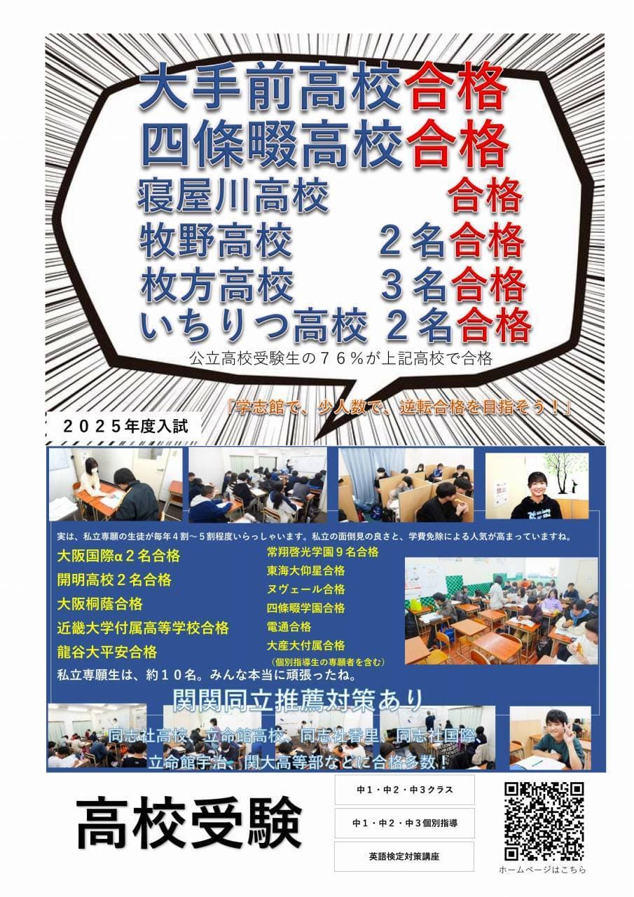 数学の平均点が20点台となり、一桁の得点でも大手前高校や四條畷高校に合格ができた年度があるぐらい数学が難しい事をご存知ですか?お子様は数学が得意ですか?(得意でも、上記のようなハイレベルな戦いで結果が出せるぐらい得意ですか?そうでないとしたらどうすべきですか?)、お子様は数学が不得意ですか?(逆に数学が不得意な場合はどうすべきなのかご存知ですか?)。寝屋川高校や府大高専、牧野高校、枚方高校などに多くの合格を出してきた学志館で、是非頑張ってみませんか?体験授業をお待ちしております。