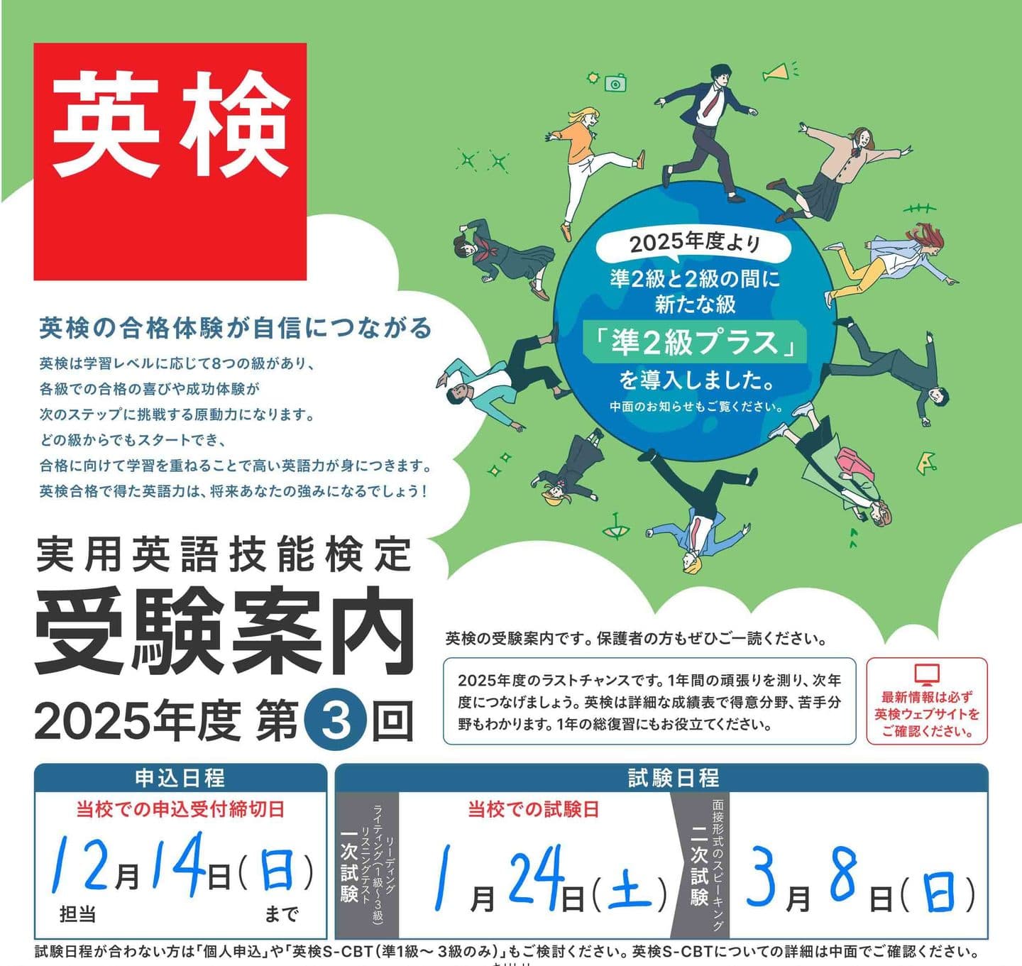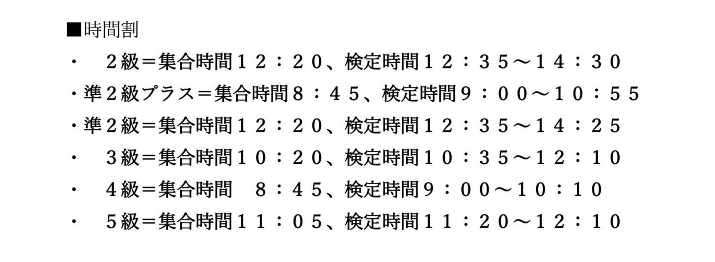 ※上記は、当日変更となる場合がございます。検定の注意点をしっかりと聞き、その指示に従うようにしてください。筆記用具をお忘れの場合など、対応できるものは、可能な限り対応させていただきます。