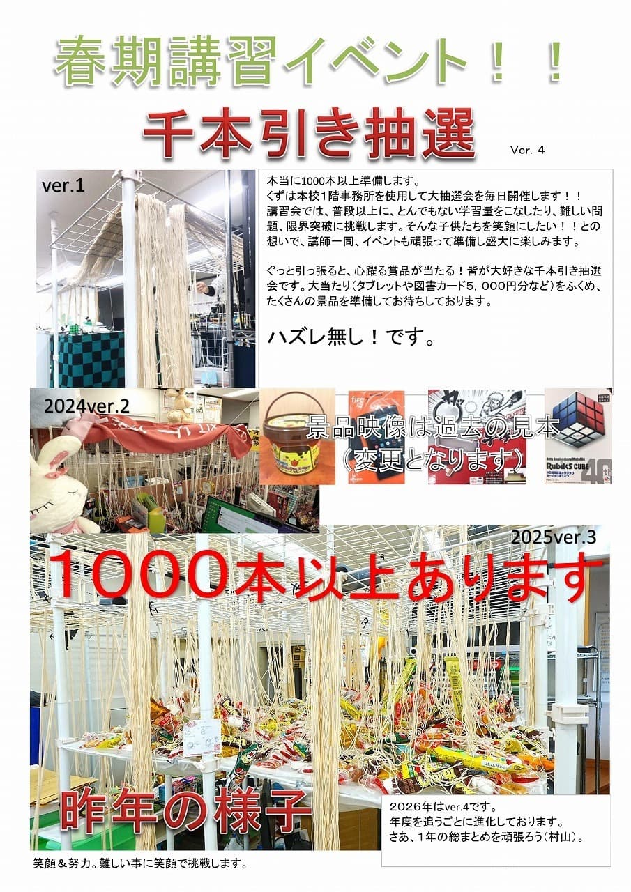 受験学年以外は、「授業テキスト」「授業内で配布のプリント」「パーフェクトテスト(小2~中3。高校生は別プリント)」が基本となりますが、際限なく無料で追加のプリントをお渡しするものではございません。各講習会ごとに、若干の違いはございますが、上記課題が終了いたしましたら通常授業テキストのやり残しを先に仕上げに来るなど最後のフォローをさせていただき、無料の質問できる自習室の使用は終了となります。(その場合、追加プリントはご用意できませんが、完全な自習室の解放は行っております。ご相談ください)
