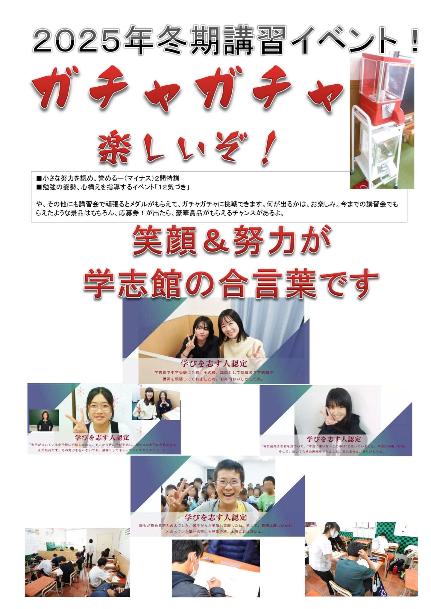 少し安くて、授業時間は同じ(か多い)、無料の特訓を利用して、ライバルの2倍以上、学志館で一緒に頑張ろうよ!という塾を目指しています。